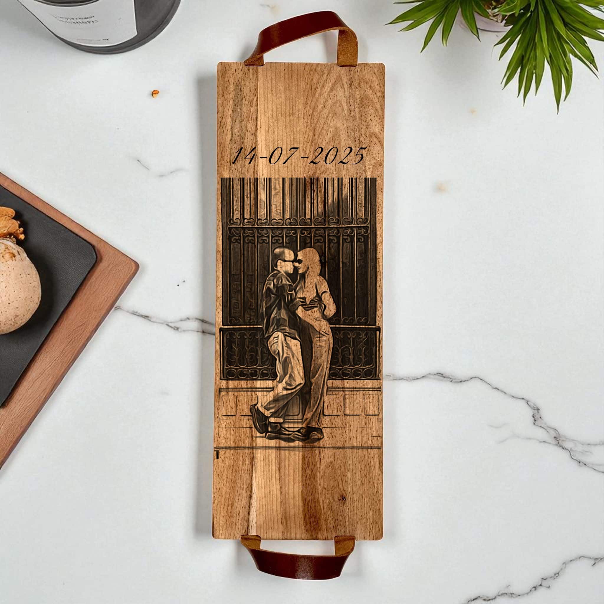 Personaliseer de plank met jouw eigen ontwerp of foto via onze gebruiksvriendelijke tool โ wij graveren het diep en haarscherp in het hout. Liever iets laten maken? Stuur ons een foto en wij creรซren een professionele lijnschets die jouw herinnering vereeuwigt.